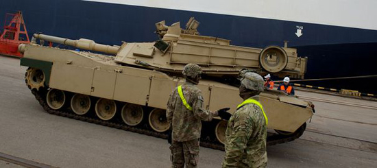 | Un char américain Abrams, lors de son débarquement sur le port de Riga, le 5 mars. |