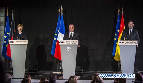 "Je pense aux familles, à leurs proches, et j'exprime au nom de la France à Angela Merkel et Mariano Rajoy, nos sentiments les plus tristes de condoléances. Le peuple fran?ais est ici à vos c?tés dans cette épreuve comme il l'est auprès de tous les pays concernés, plus d'une quinzaine de leurs ressortissants étaient dans cet avion", a tout d'abord déclaré M. Hollande lors d'une conférence de presse à Seyne-les-Alpes, commune située juste à c?té du lieu de du crash.