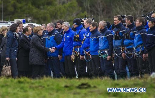 Arrivés ensemble par hélicoptère, Angela Merkel et Fran?ois Hollande ont survolé la zone du crash de l'Airbus A320 puis se sont recueillis avec Mariano Rajoy, arrivé par la route, dans la chapelle ardente installée à Seyne-les-Alpes, village montagnard situé à proximité du lieu du crash, sans rencontrer les familles et proches des victimes qui arrivent au fur et à mesure de l'après-midi.