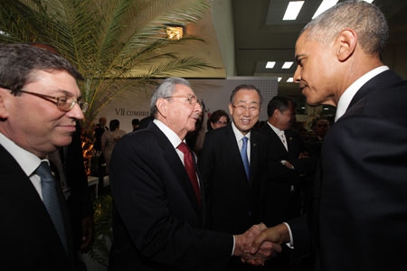 Le président américain Barack Obama et son homologue cubain Raul Castro se sont salués et se sont serré la main vendredi lors du 7e sommet des Amériques à Panama.