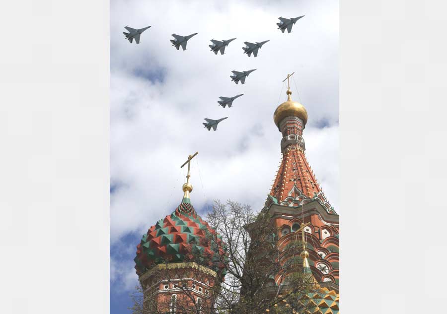 Les avions de chasse russes Su-30SM et Su-35S pour un dernier passage en formation avant le grand Défilé de la Victoire du 9 mai, avec au premier plan la cathédrale Saint-Basile, au centre de Moscou, le 5 mai 2015. [Photo/Agences]