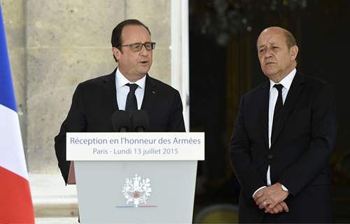 Le chef d'Etat a salué l'engagement des armées pour la défense de ces valeurs et souligué que la menace a atteint un niveau qui n'a pas d'équivalent dans l'histoire récente et justifie la mobilisation exceptionnelle des armées?, en référence aux 10 000 soldats déployés en urgence sur le territoire national au lendemain des attentats de janvier. Désormais, l'opération baptisée Sentinelle compte 7 000 militaires mobilisés en permanence pour la défense de lieux sensibles, notamment juifs.