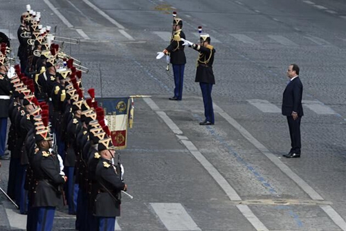 Francois Hollande écoute la Marseillaise,jouée par la Garde Républicaine.