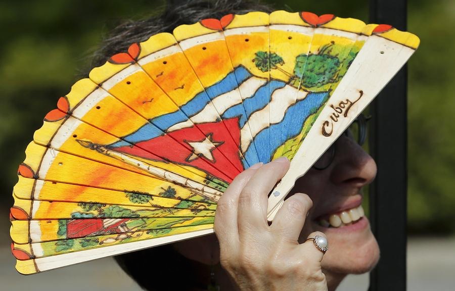 En attendant la grande cérémonie marquant la réouverture de l’Ambassade de Cuba, une invitée se protège du soleil avec un éventail sur lequel est peint le drapeau cubain.