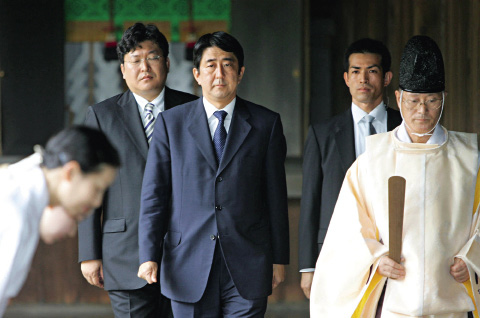 | Le 26 décembre 2013, le premier ministre japonais Shinzo Abe en pèlerinage au sanctuaire Yasukuni, à Tokyo. |