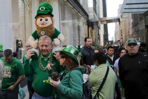 Des gens se rassemblent autour de Times Square pour célébrer la Journée de la parade de la Saint-Patrick, le 17 mars 2016 à New York. [Photo / Agences]