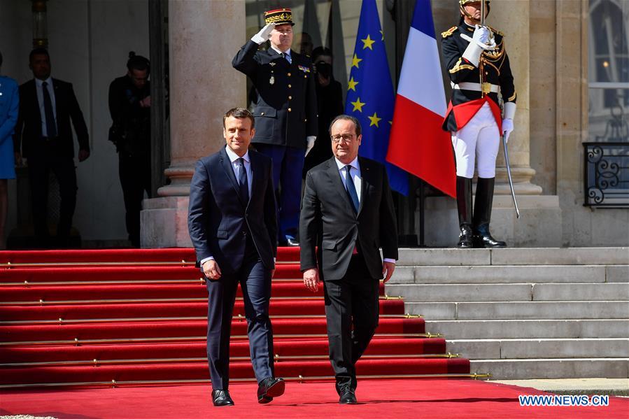 Après avoir remonté très lentement le tapis rouge déployé dans la cour d'honneur, le plus jeune président de la République jamais élu en France (39 ans) et son prédécesseur ont rejoint le bureau présidentiel pour un entretien qui a duré une heure.