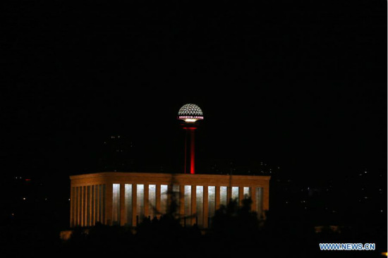 La tour Atakule, monument phare d'Ankara, la capitale de la Turquie, a été illuminée en rouge et jaune lundi soir, aux couleurs de la Chine, pour célébrer le 70e anniversaire de la fondation de la République populaire de Chine (RPC).