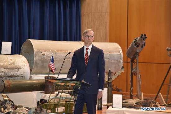 Le ministre d'Etat saoudien des Affaires étrangères, Adel Al-Jubeir, et le représentant spécial des Etats-Unis pour l'Iran, Brian Hook, ont tenu une conférence de presse conjointe à Ryad, où des armes, notamment des drones et des missiles, qui ont été utilisées lors des récentes attaques des Houthis contre des villes saoudiennes, ont été exposées.