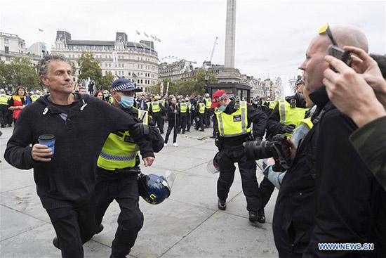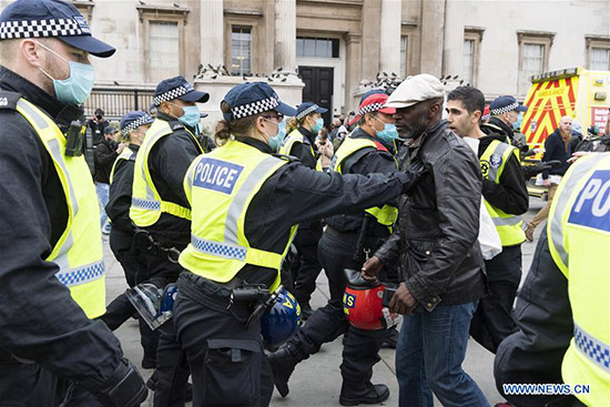 Au moins trois manifestants et un policier ont été blessés et pris en charge par le personnel médical samedi lors d'affrontements qui ont suivi une manifestation anti-confinement à Trafalgar Square, dans le centre de Londres, après que la police a ordonné aux manifestants de se disperser parce qu'ils n'avaient pas respecté les règles de distanciation sociale.
