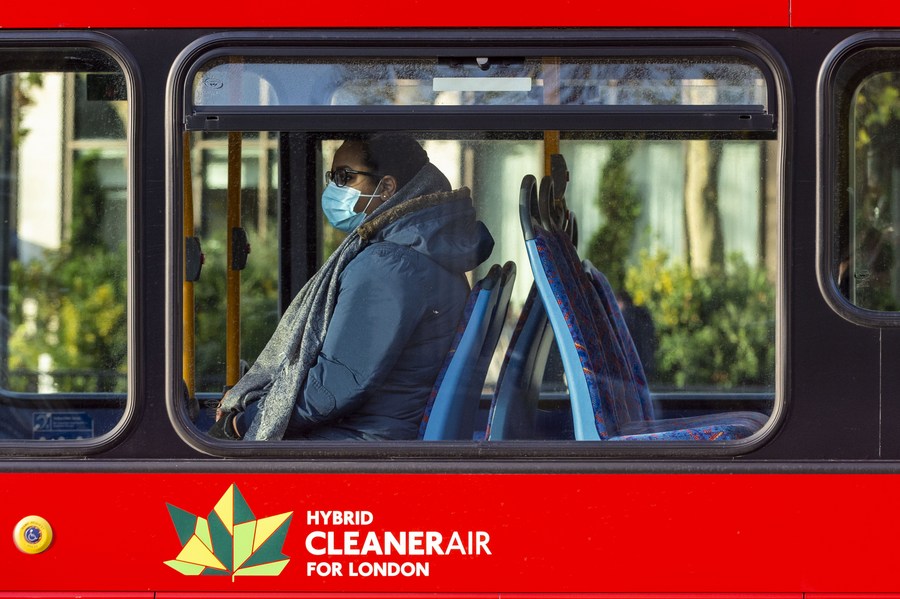 Une passagère portant un masque à bord d'un bus à Londres, la capitale britannique, le 9 décembre 2021. (Xinhua/Stephen Chung)