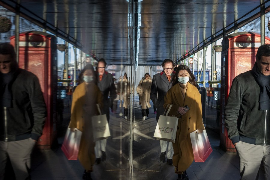 Des gens marchent dans une rue de Londres, la capitale britannique, le 9 décembre 2021. (Xinhua/Stephen Chung)