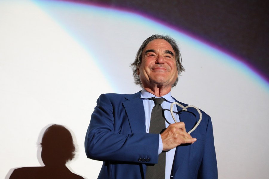 Le célèbre réalisateur américain Oliver Stone montre en recevant son prix lors du 23e Festival du film de Sarajevo, en Bosnie-Herzégovine, le 13 ao?t 2017. (Xinhua/Haris Memija)