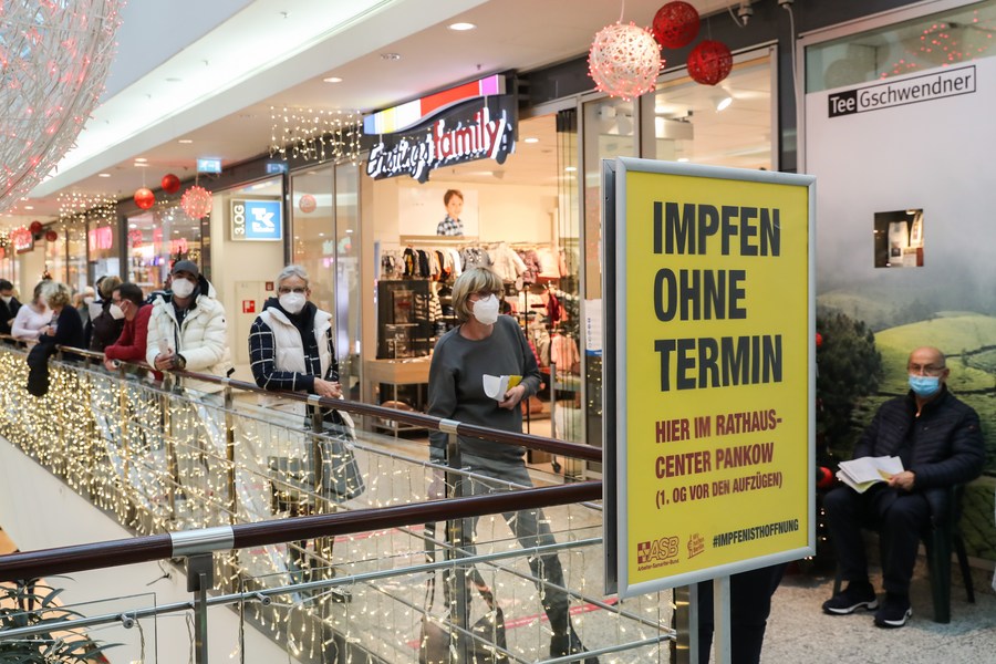 Des gens font la queue pour se faire vacciner contre la COVID-19 dans un poste de vaccination à l'intérieur d'un centre commercial à Berlin, en Allemagne, le 25 novembre 2021. (Xinhua/Shan Yuqi)