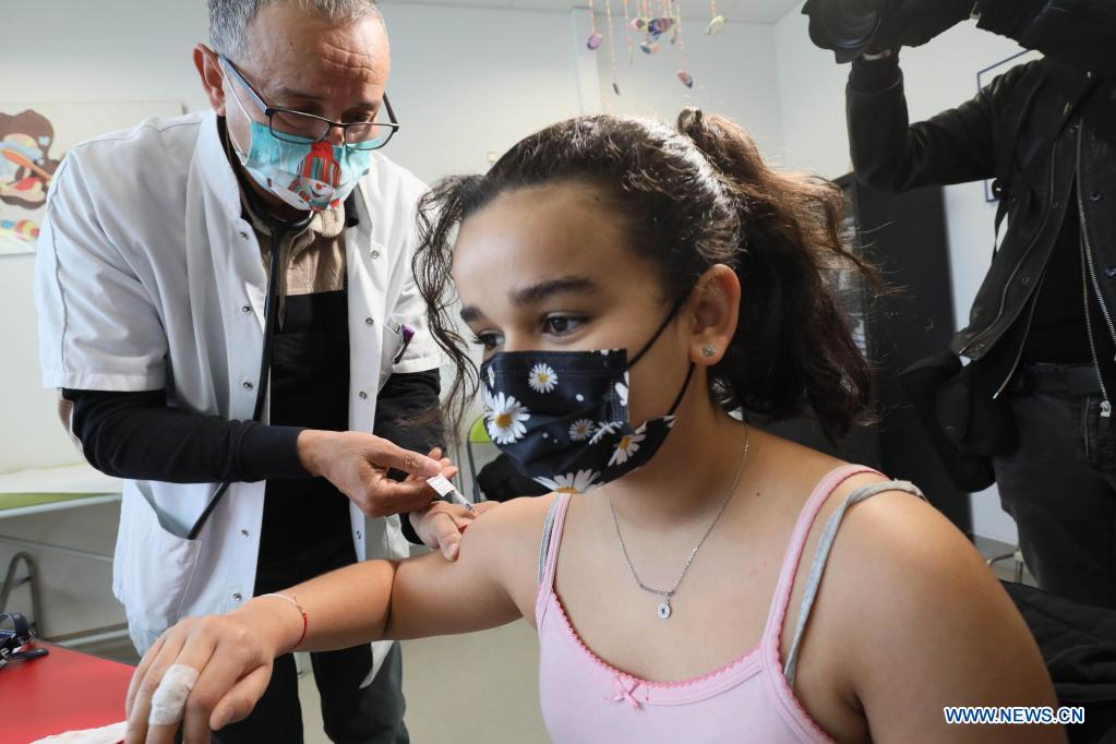 Un enfant re?oit une dose de vaccin contre la COVID-19 dans un h?pital à Antibes, en France, le 23 décembre 2021. La France a lancé mercredi la vaccination contre la COVID-19 des enfants agés de 5 à 11 ans. (Xinhua/Serge Haouzi)