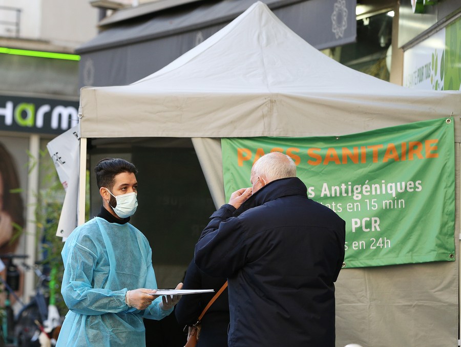Un résident discute avec un travailleur de santé dans un point de dépistage à Paris, en France, le 9 novembre 2021. (Xinhua/Gao Jing)