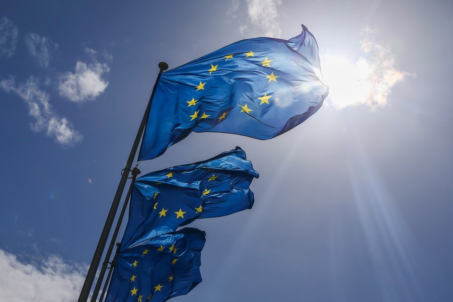 Photo prise le 21 mai 2021 montrant des drapeaux de l'Union européenne (UE) flottant devant le siège de l'UE à Bruxelles, en Belgique. (Xinhua/Zheng Huansong)