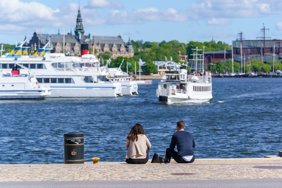 Des gens profitent du soleil au bord de mer à Stockholm, en Suède, le 1er juin 2021. (Wei Xuechao/Xinhua)