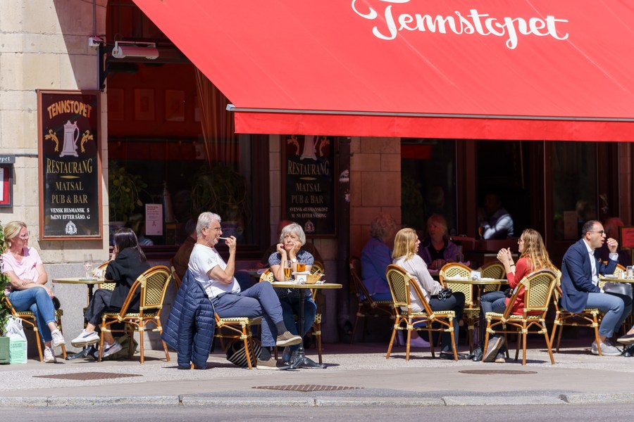 Des clients en terrasse d'un restaurant à Stockholm, en Suède, le 1er juin 2021. (Wei Xuechao/Xinhua)