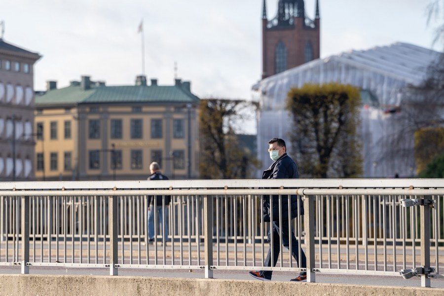 Un homme portant un masque marche dans une rue de Stockholm, la capitale de la Suède, le 3 novembre 2020. (Wei Xuechao/Xinhua)