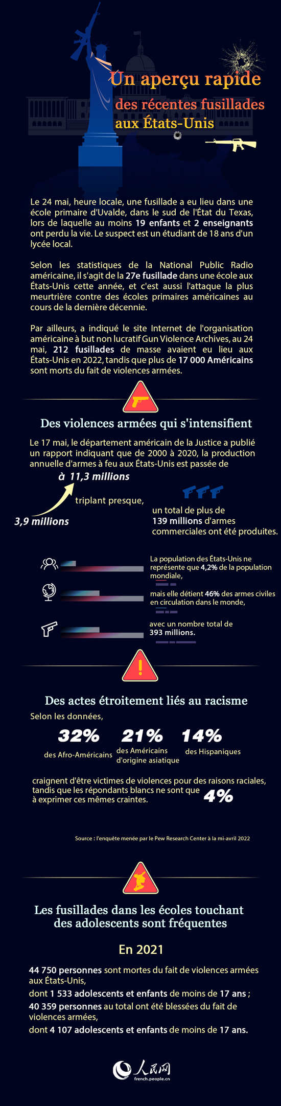 Par ailleurs, a indiqué le site Internet de l'organisation américaine à but non lucratif Gun Violence Archives, au 24 mai, 212 fusillades de masse avaient eu lieu aux états-Unis en 2022, tandis que plus de 17 000 Américains sont morts du fait de violences armées.