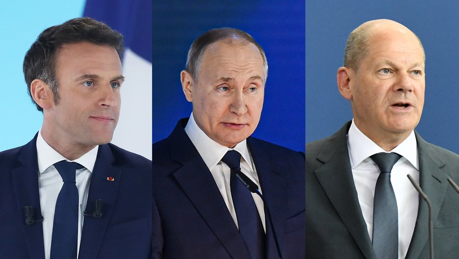 Photos d'archives du président fran?ais Emmanuel Macron (à gauche), du président russe Vladimir Poutine (au centre) et du chancelier allemand Olaf Scholz. (Xinhua)