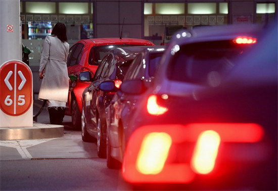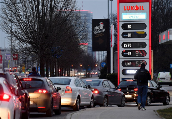 Des véhicules font la queue devant une station-service alors que les prix du carburant devront augmenter le lendemain, le 7 mars 2022 à Zagreb, en Croatie. (Marko Lukunic/PIXSELL via Xinhua)
