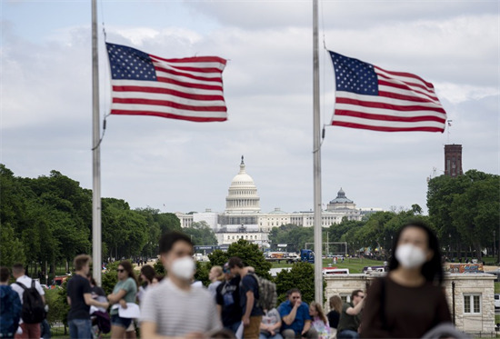 Des drapeaux nationaux américains en berne au Washington Monument en mémoire du million d'Américains morts de la COVID-19, le 12 mai 2022 à Washington, D.C., aux Etats-Unis. (Xinhua/Liu Jie)