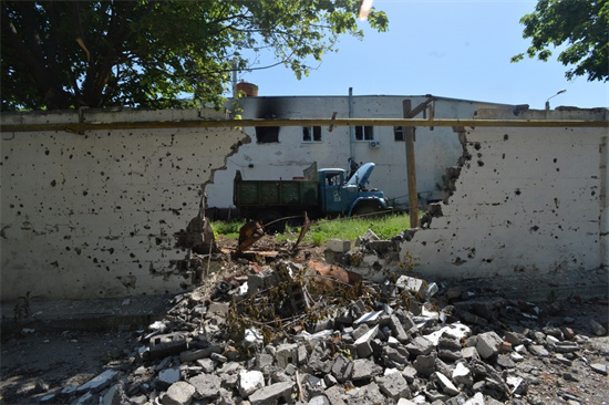 Photo prise le 2 juin 2022 montrant un batiment et un véhicule endommagés à Kharkov, en Ukraine. (Xinhua/Peter Druk)