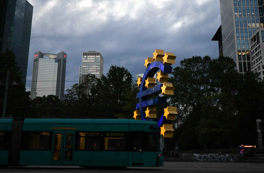 Photo prise le 1er juin 2022 montrant la sculpture géante de l'euro, dans la ville de Francfort, en Allemagne. (Xinhua/Lu Yang)