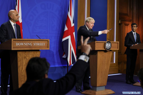 Photo d'archives prise le 7 septembre 2021 montrant le Premier ministre britannique Boris Johnson (C), le secrétaire britannique à la Santé Sajid Javid (G) et le chancelier de l'Echiquier Rishi Sunak. (Xinhua)