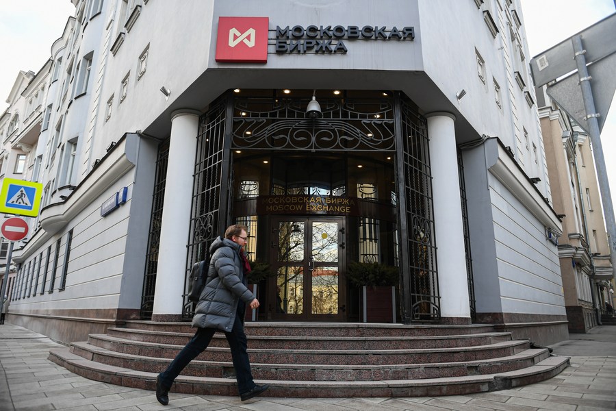 Photo prise le 24 février 2022 de la Bourse de Moscou, en Russie. (Xinhua/Evgeny Sinitsyn)