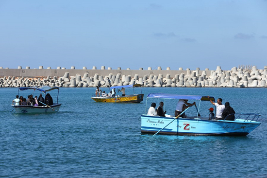 Des gens canotent en mer avec des digues en béton utilisées contre la hausse du niveau de la mer en arrière-plan à Alexandrie, en Egypte, le 19 juin 2022. (Xinhua/Ahmed Gomaa)
