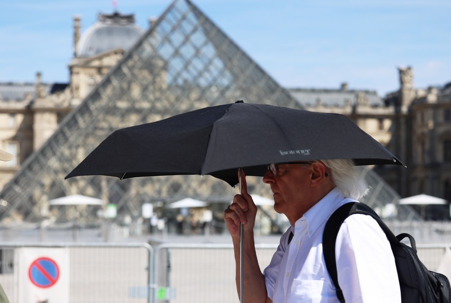 Un homme tenant un parapluie marche devant le Musée du Louvre en raison de la canicule à Paris, en France, le 13 juillet 2022. (Xinhua/Gao Jing)