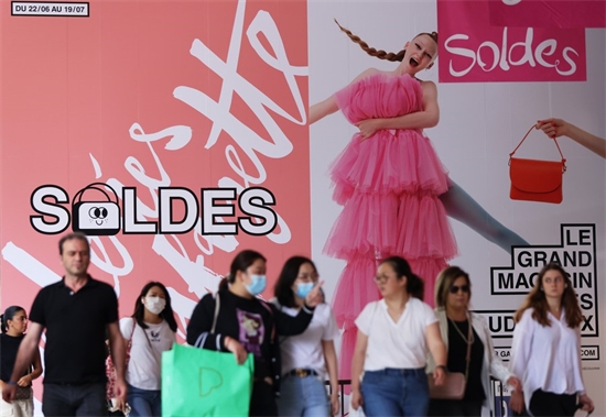 Des gens passent devant une affiche géante annon?ant les soldes d'été devant le Grand Magasin des Galeries Lafayette à Paris, France, le 22 juin 2022. (Xinhua/Gao Jing)