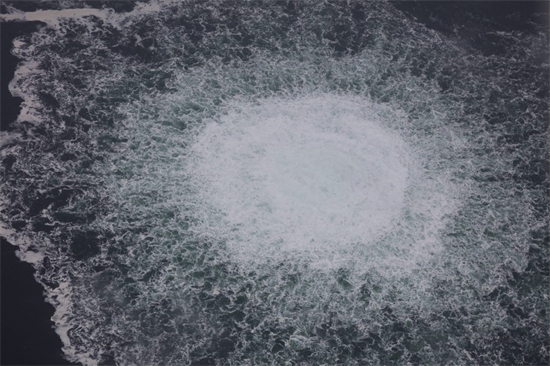 Photo aérienne fournie par les gardes-c?tes suédois le 28 septembre 2022 montrant une quatrième fuite de gaz au-dessus des gazoducs Nord Stream 2 dans la zone économique exclusive de la Suède. (Les gardes-c?tes suédois/via Xinhua)
