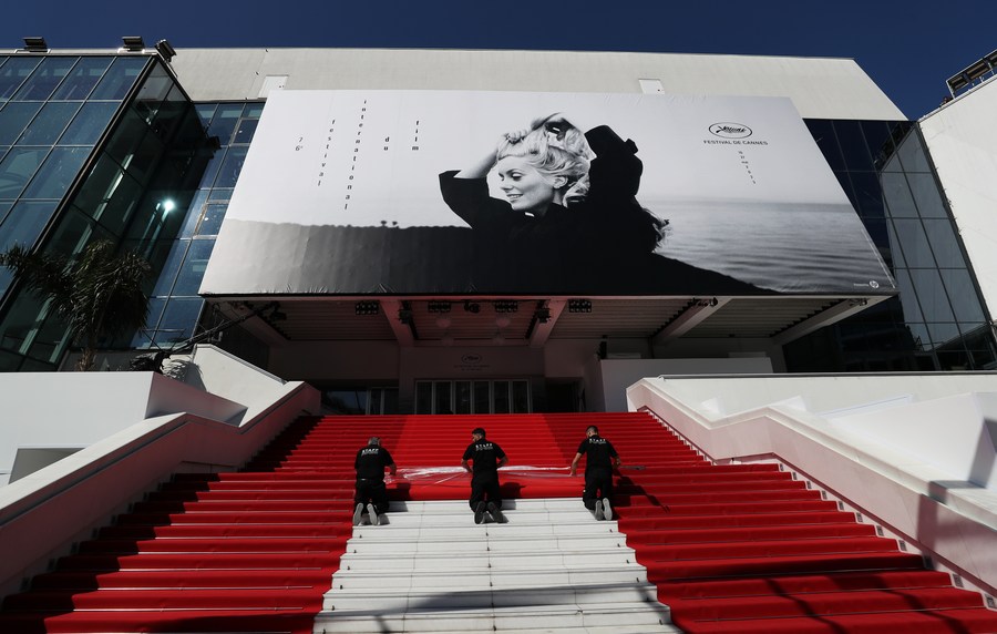 Des membres du personnel déroulent le tapis rouge sur les marches du Palais des Festivals de Cannes, dans le sud-est de la France, le 16 mai 2023. (Xinhua/Gao Jing)