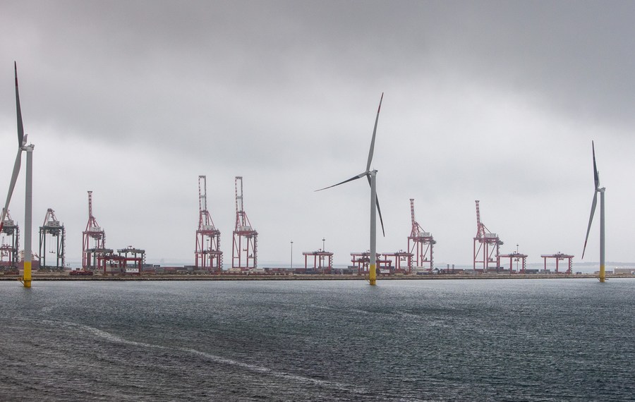 Photo prise le 21 avril 2022 d'un parc éolien en mer au port de Tarente, en Italie. (Xinhua/Liu Yongqiu)