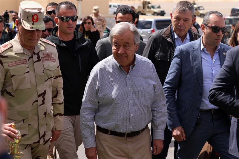 | Le secrétaire général des Nations Unies Antonio Guterres visite le c?té égyptien du point de passage de Rafah, à la frontière avec la bande de Gaza, le 23 mars 2024. (Xinhua/Mohamed Ahmed) |