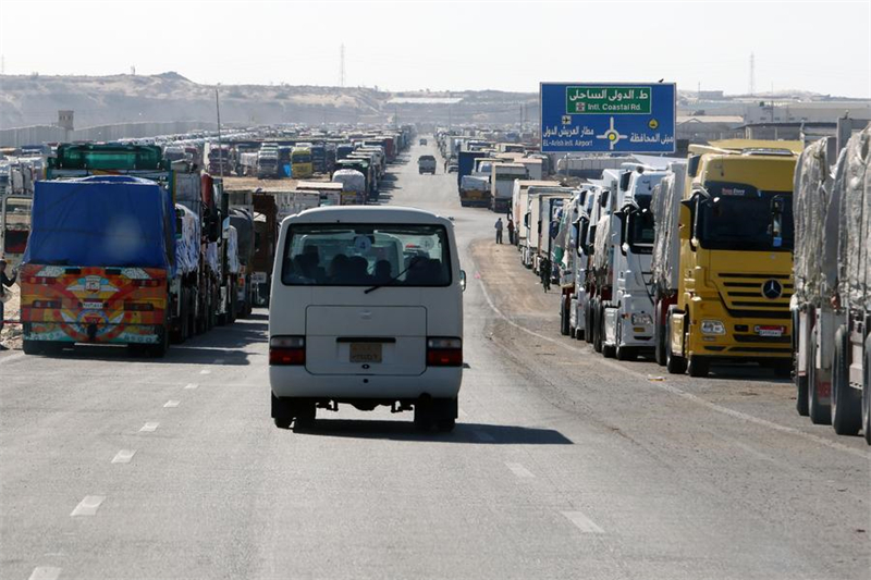 | Photo prise le 23 mars 2024 montrant des camions transportant de l'aide sur le c?té égyptien du point de passage de Rafah, à la frontière avec la bande de Gaza. (Xinhua/Mohamed Ahmed) |