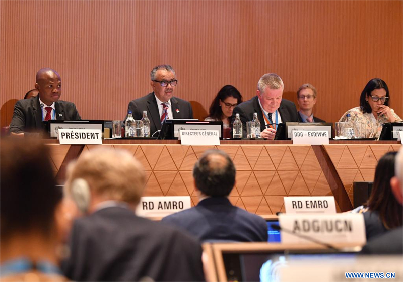 | Tedros Adhanom Ghebreyesus (2e à gauche), directeur général de l'Organisation mondiale de la santé (OMS), s'exprime lors de la 77e Assemblée mondiale de la santé (AMS) à Genève en Suisse, le 27 mai 2024 . La 77e AMS de six jours, sous le thème "Tous pour la santé, la santé pour tous", s'est ouverte lundi. (Xinhua/Lian Yi) |