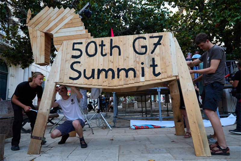 | Des jeunes fabriquent un modèle de "cheval de Troie" pour protester contre le sommet du Groupe des Sept (G7) à Brindisi, en Italie, le 13 juin 2024. (Xinhua/Meng Dingbo) |