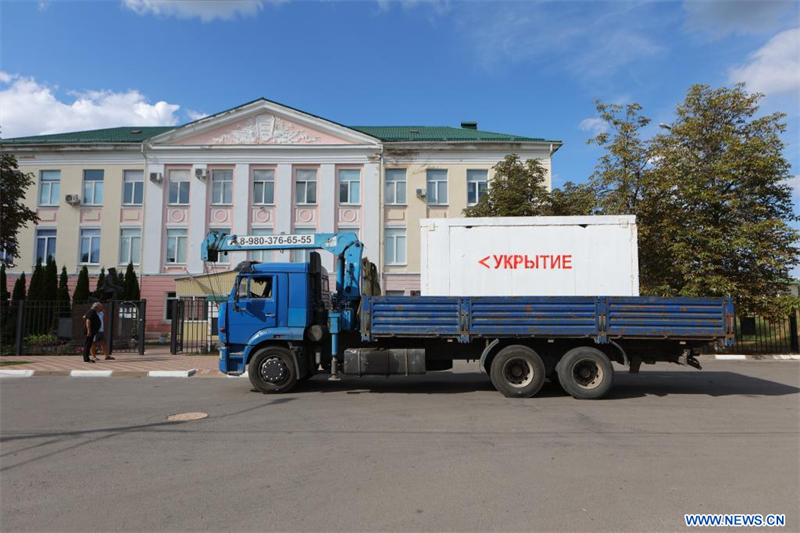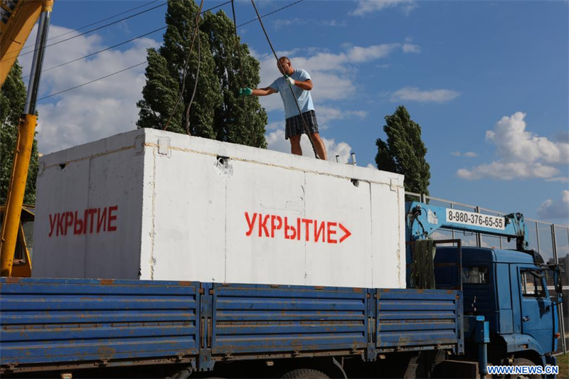 | Un homme vérifie un abri modulaire en béton doublement renforcé, con?u pour protéger les civils des bombardements, à Belgorod, en Russie, le 9 ao?t 2024. Quatre-vingt-trois projectiles ont été tirés au cours de 19 bombardements d'artillerie et 16 frappes de drones sur une colonie et plusieurs villages du district de Krasno?arsk au cours des dernières 24 heures, endommageant le toit d'une maison inhabitée et une ligne électrique, a déclaré le gouverneur de Belgorod, Viatcheslav Gladkov. (Xinhua) |