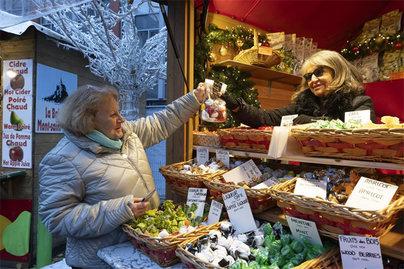 | Une cliente achète des bonbons au marché de No?l de Lille, dans le nord de la France, le 30 novembre 2024. |