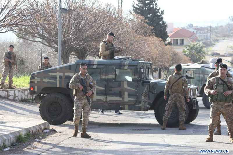 | Photo prise le 18 février 2025 montrant des membres de l'armée libanaise se positionnant à l'entrée de Kfar Kila, au Liban, après le retrait de l'armée israélienne. Un responsable du gouvernement israélien avait déclaré lundi que l'armée du pays maintiendrait des troupes dans cinq postes au sud du Liban, malgré la date limite pour son retrait total expirant mardi. (Xinhua/Taher Abu Hamdan) |