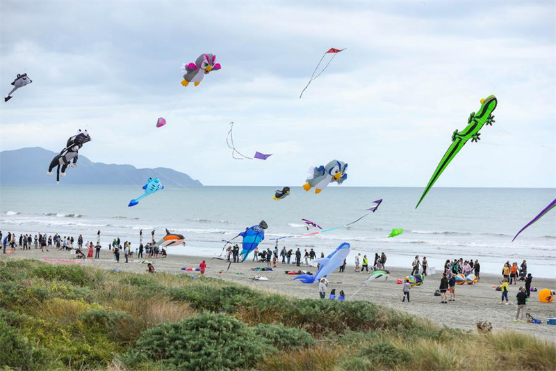 | Des gens vont voler des cerfs-volants sur la plage d'Otaki, en Nouvelle-Zélande, le 8 mars 2025. (Xinhua/Long Lei) |