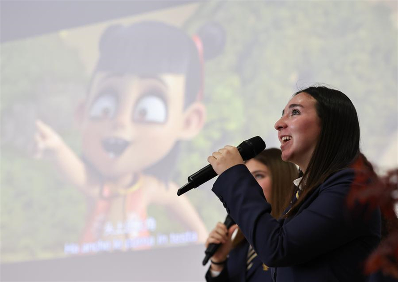 | Des élèves doublent le film d'animation chinois "Ne Zha" lors d'un événement culturel chinois intitulé "Célébrer le printemps" à Rome, en Italie, le 8 avril 2025. (Xinhua/Li Jing) |