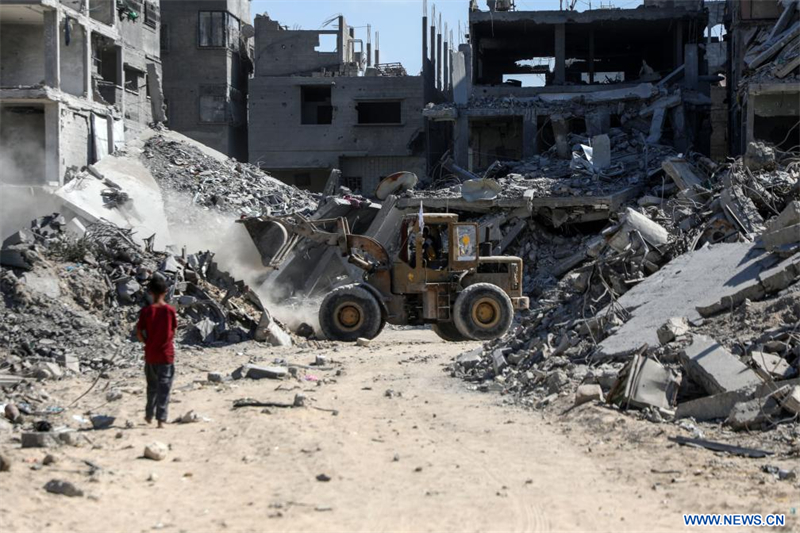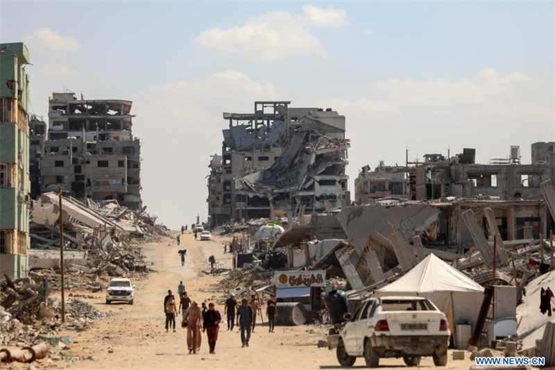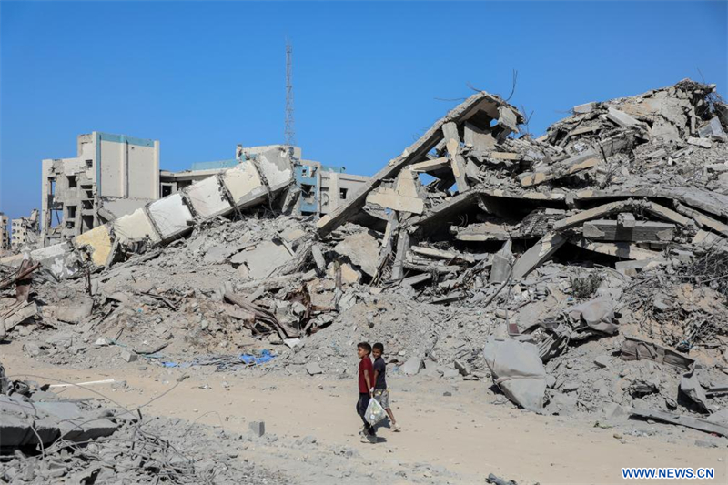 | Des personnes sont vues dans une rue bordée de batiments détruits à Gaza, le 19 octobre 2025. Les Forces de défense israéliennes (FDI) ont indiqué dimanche dans un communiqué avoir lancé une nouvelle vague de frappes contre des cibles du Hamas dans le sud de la bande de Gaza. (Xinhua/Rizek Abdeljawad) |