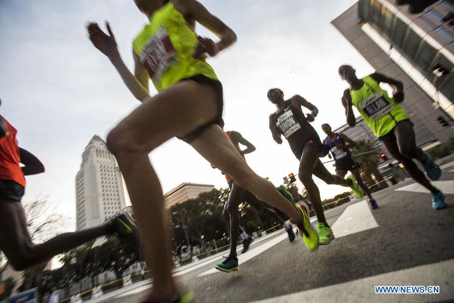 Photo prise le 15 mars 2015 montrant des coureurs lors de la 30e édition du Marathon de Los Angeles, aux Etats-Unis
