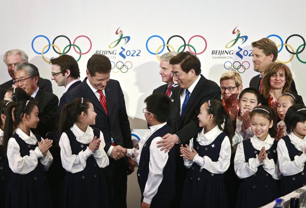 Alexandre Joukov (au centre, à gauche), président de la commission d'évaluation du CIO, et Guo Jinlong, chef du PCC de Beijing, saluent un écolier après la conférence de presse tenue à l'occasion de la visite d'inspection de la commission à Beijing samedi. Photo : Feng Yongbin / China Daily